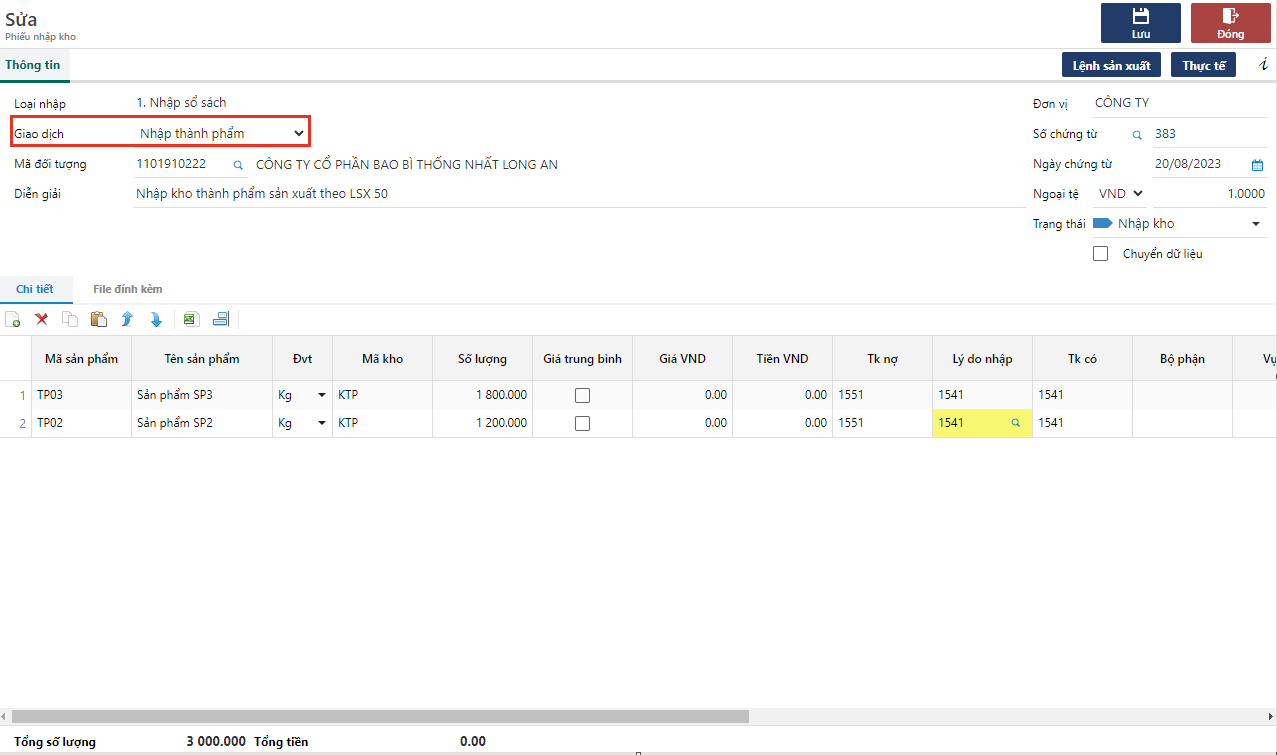 * Mã đối tượng: Có thể định nghĩa đối tượng nhập kho sản xuất theo khách hàng trên đơn hàng cần sản xuất, theo phân xưởng hoặc theo mã đối tượng chung của doanh nghiệp.