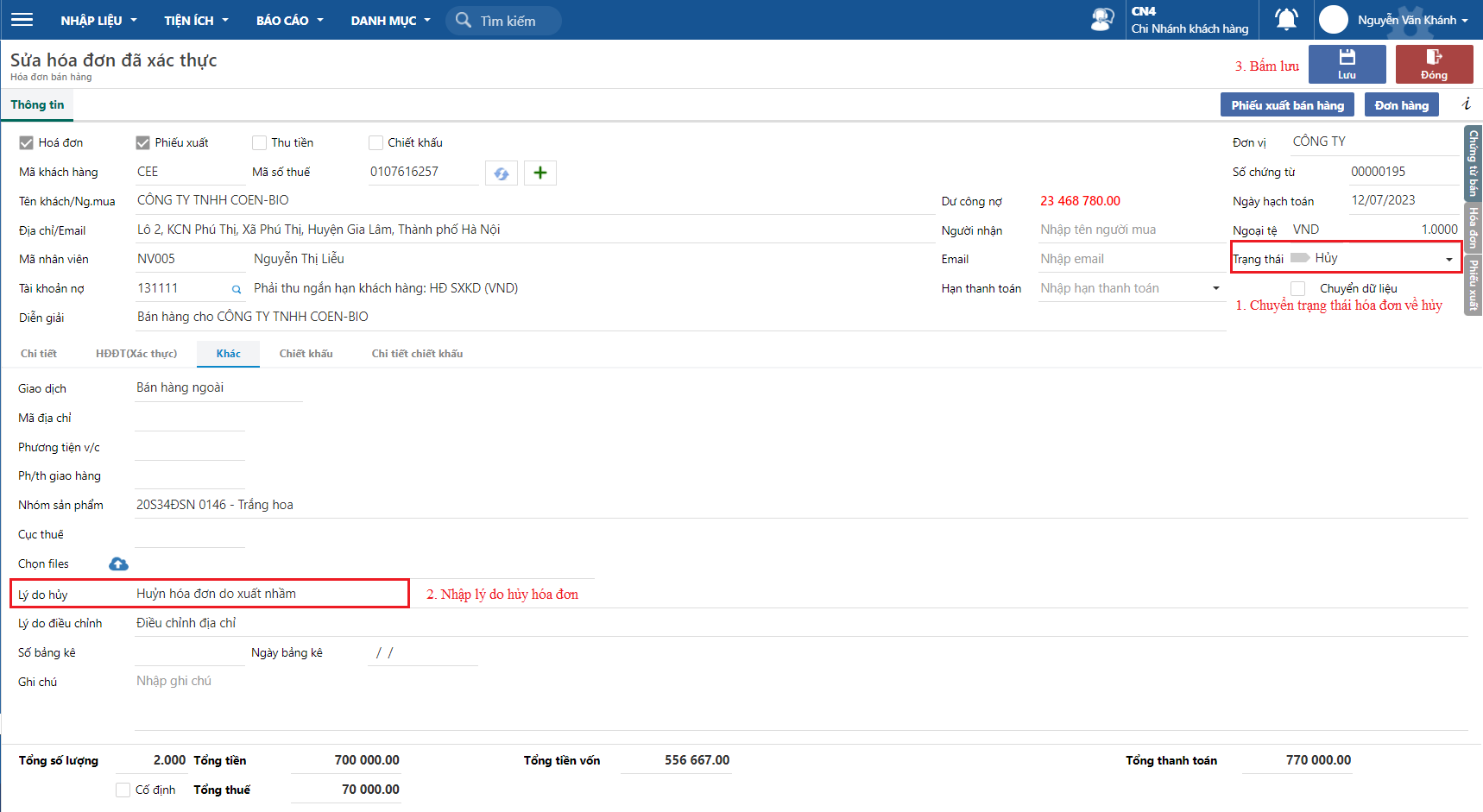 Truy cập vào phần mềm, chọn hóa đơn cần hủy, nhấn **Sửa** để chuyển sang trạng thái Hủy và nhập lý do hủy hóa đơn.