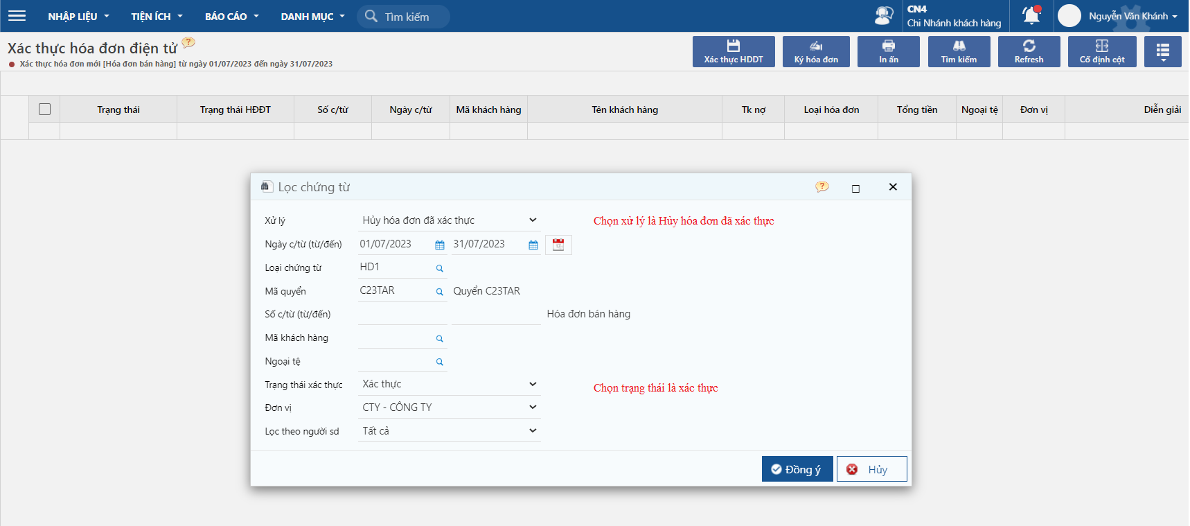 Truy cập chức năng phát hành hóa đơn điện tử tại đường dẫn ***Bán hàng/ Nhập liệu/ Hóa đơn điện tử/ Xác thực hóa đơn điện tử,*** lựa chọn Xử lý "Hủy hóa đơn đã xác thực" và các thông tin rồi nhấn **Đồng ý.**