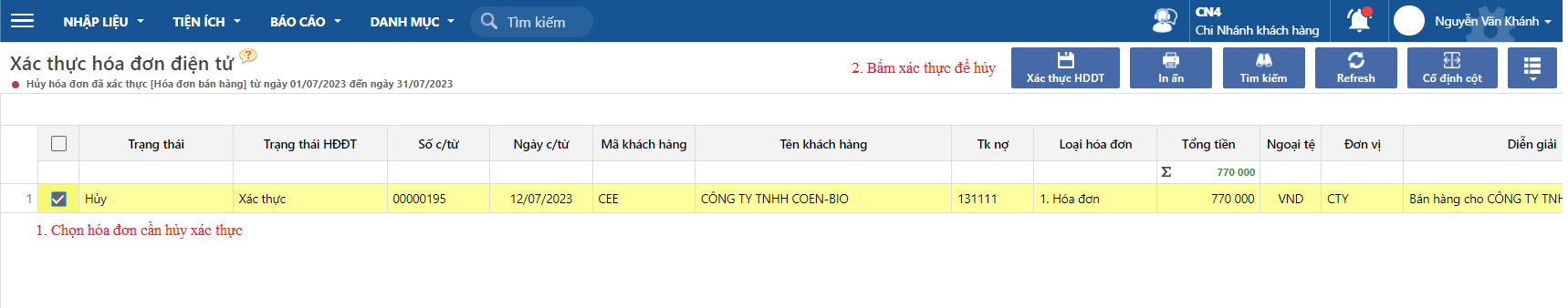 Check chọn hóa đơn cần hủy sau đó nhấn "Xác thực HĐĐT"