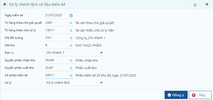 * &#x20;Xử lý Xử lý chênh lệch hoặc xóa kết quả xử lý. Nếu kết quả kiểm kê thừa thì chương trình sẽ tự động tạo 1 phiếu nhập kho hạch toán nợ tk vật tư/ Có tk hàng thừa chờ xử lý. Nếu kết quả kiểm kê thiếu thì chương trình sẽ tự động tạo 1 phiếu xuất kho hạch toán nợ tk hàng thiếu chờ xử lý/ Có tk vật tư.