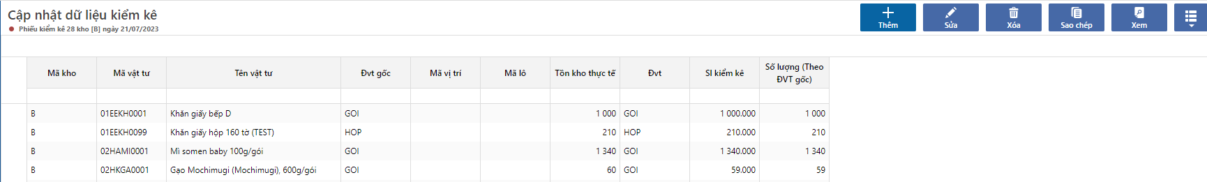* Số lượng (Theo dvt gốc): Số lượng sau khi được kiểm kê chương trình sẽ tự động quy đổi về đvt gốc
