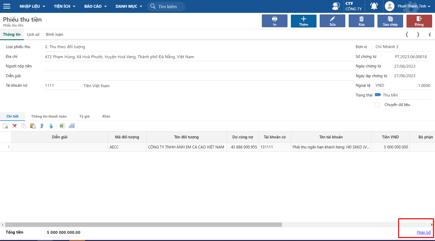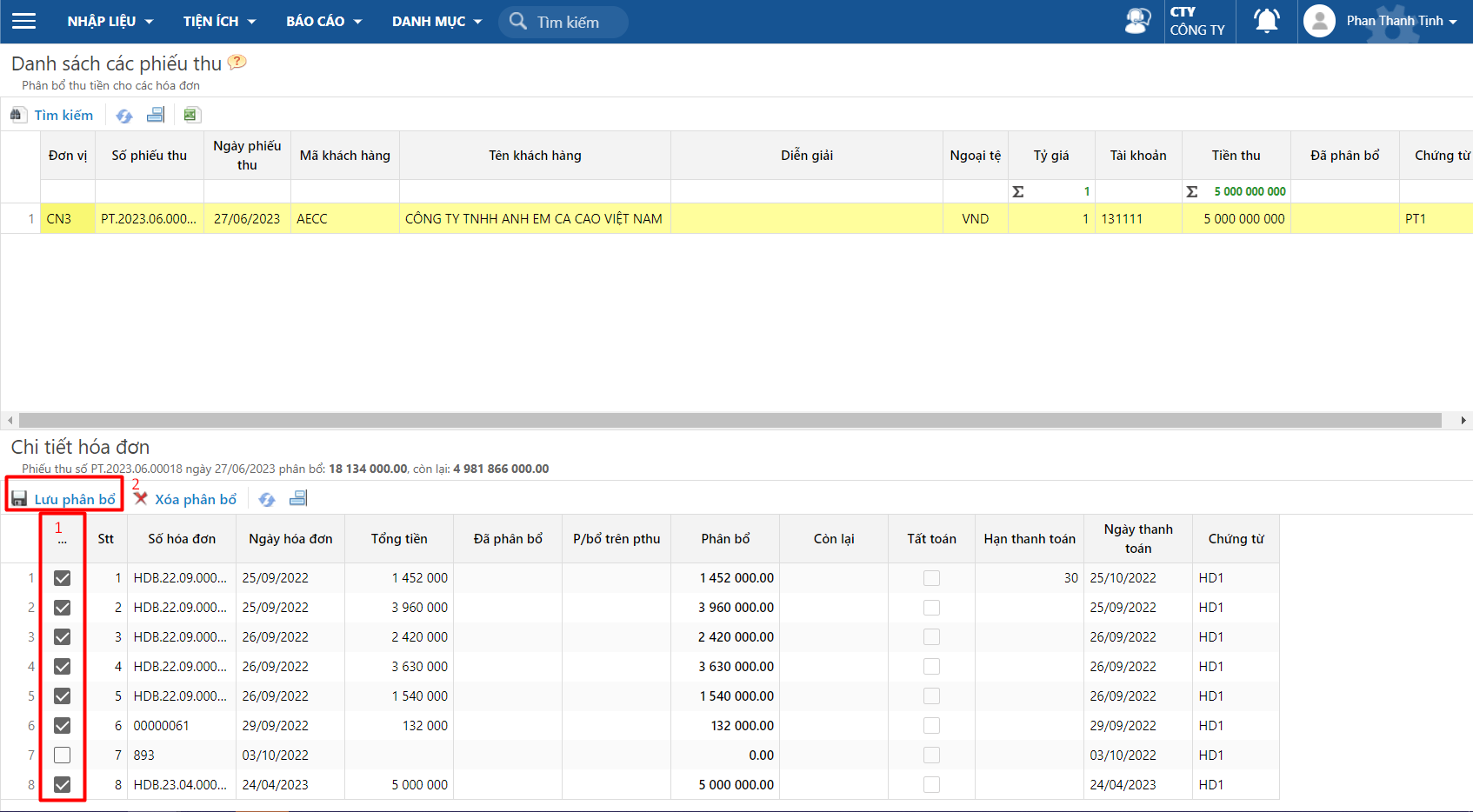 **Bước 5:** Phân bổ tiền thu cho hoá đơn.