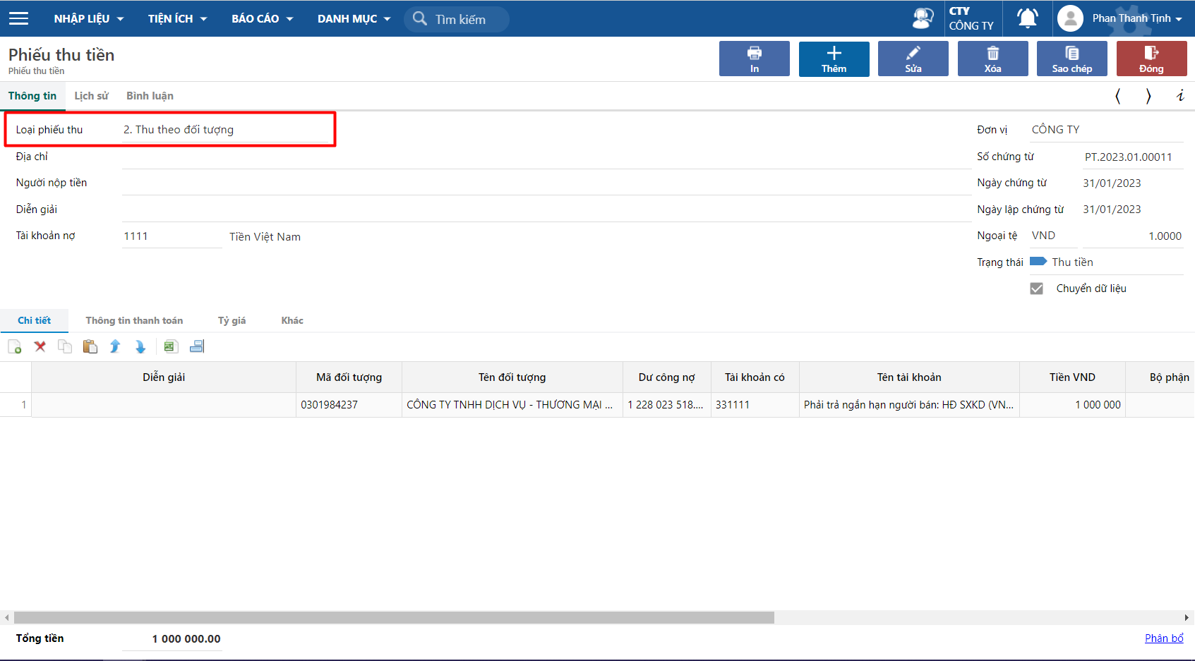Nghiệp vụ dùng khi thu tiền theo đối tượng công nợ (khách hàng). Ngoài ra còn dùng trong việc thu các khoản đặt cọc, tạm ứng của khách hàng.