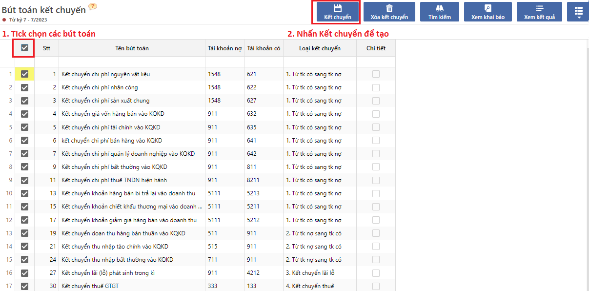 **Bước 3:** Tick chọn các bút toán sau đó nhấn nút **Kết chuyển**