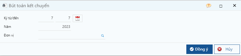 **Bước 2:** Chọn thời gian cần kết chuyển, sau đó nhấn **Đồng ý**. Chương trình sẽ xử lý tập hợp dữ liệu từ kỳ đến kỳ và tạo bút toán vào ngày cuối của kỳ đến.